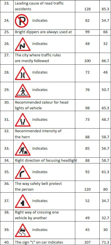 The findings of present study showed that majority of secondary school students i.e. 68.7% had average awareness and only 25.3% had good awareness. This finding is similar to the study conducted among school children in Indore, Chandigarh, Chennai and Guntur city. 7-10 65.3% of the students were aware about the traffic rules. This finding is consistent with findings of the study conducted among medical students in Barabanki, Utta Pradesh.11 56.7% of the students were aware about the rules for pedestrians. This finding is contradictory to study conducted among medical students in Barabanki, Utta Pradesh where the awareness was high. 11 58.7% students knew the legal age for driving vehicles. This finding is similar with the studies conducted in Indore, Chandigarh, Guntur city and rural Tamil Nadu, whereas this was low as compared to study conducted among medical students in Barabanki, Utta Pradesh. 7-8, 10-12 32.7% of students were aware about right way of overtaking. This finding is similar to the study conducted among school going students in Indore and Chandigarh.7-8 Almost half of the students were able to identify the road signs correctly. Similar findings were observed in the study conducted among high school students in Guntur city and rural area of Tamil Nadu, whereas good knowledge on road signs was observed among medical students in Barabanki, Utta Pradesh. 11-12 Zebra crossing sign was known to half (50.7%) of the students which was high as compared to study conducted in Chandigarh (39.5%) and Indore (21%).8,13 76.7% and 73.3% of students had correct awareness of red and yellow traffic signals respectively, this awareness was much higher than the study conducted among school going teenagers in Indore.7